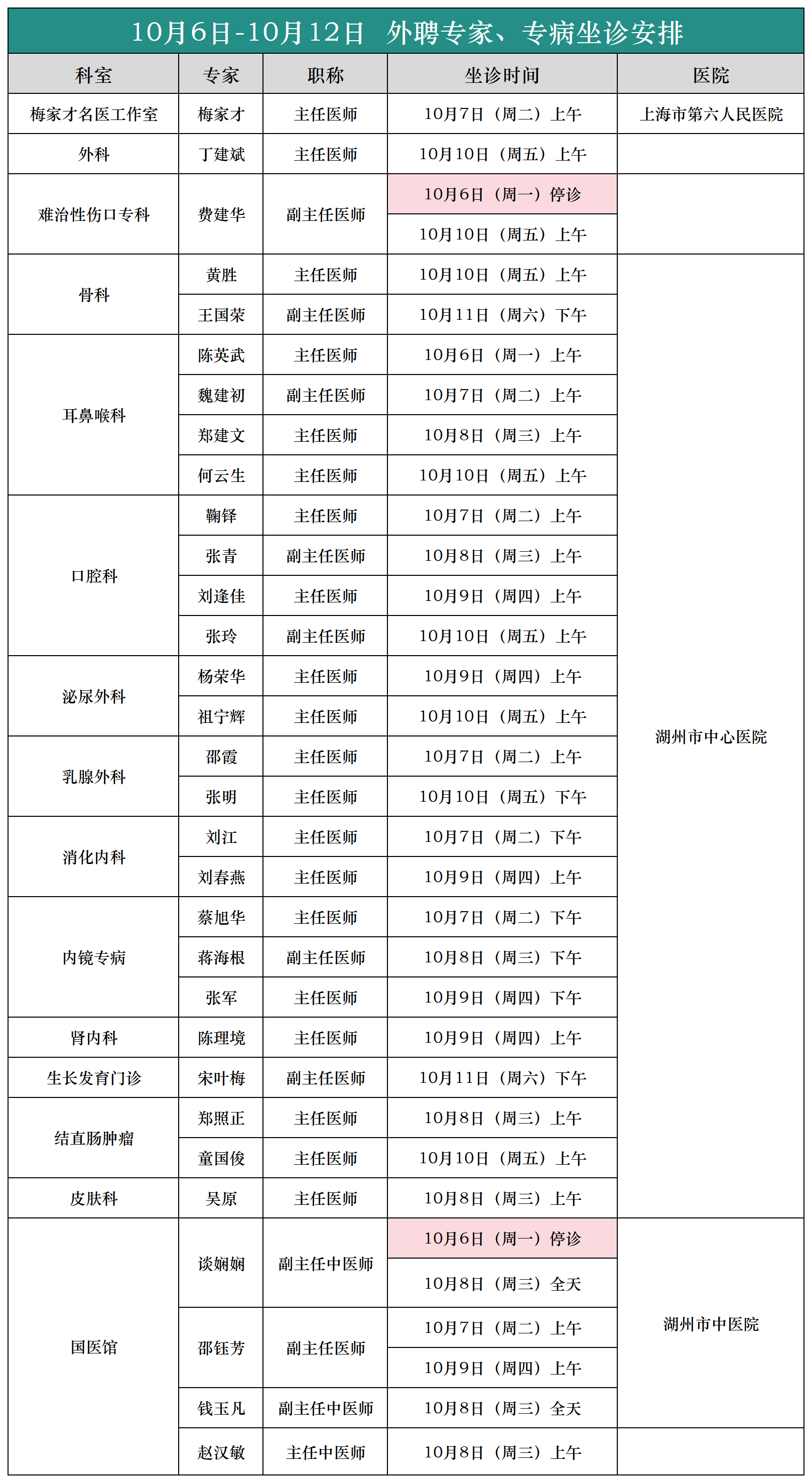 【专家|医讯】吴兴区中西医结合医院(10月6日--10月12日)专家、专病门诊安排
