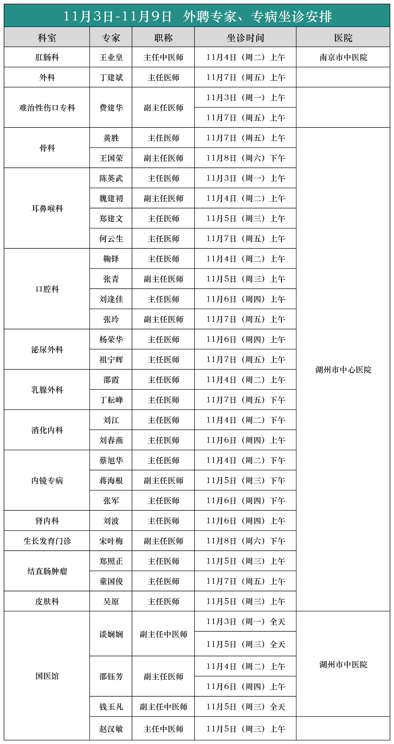 【专家|医讯】吴兴区中西医结合医院(11月3日--11月9日)专家、专病门诊安排