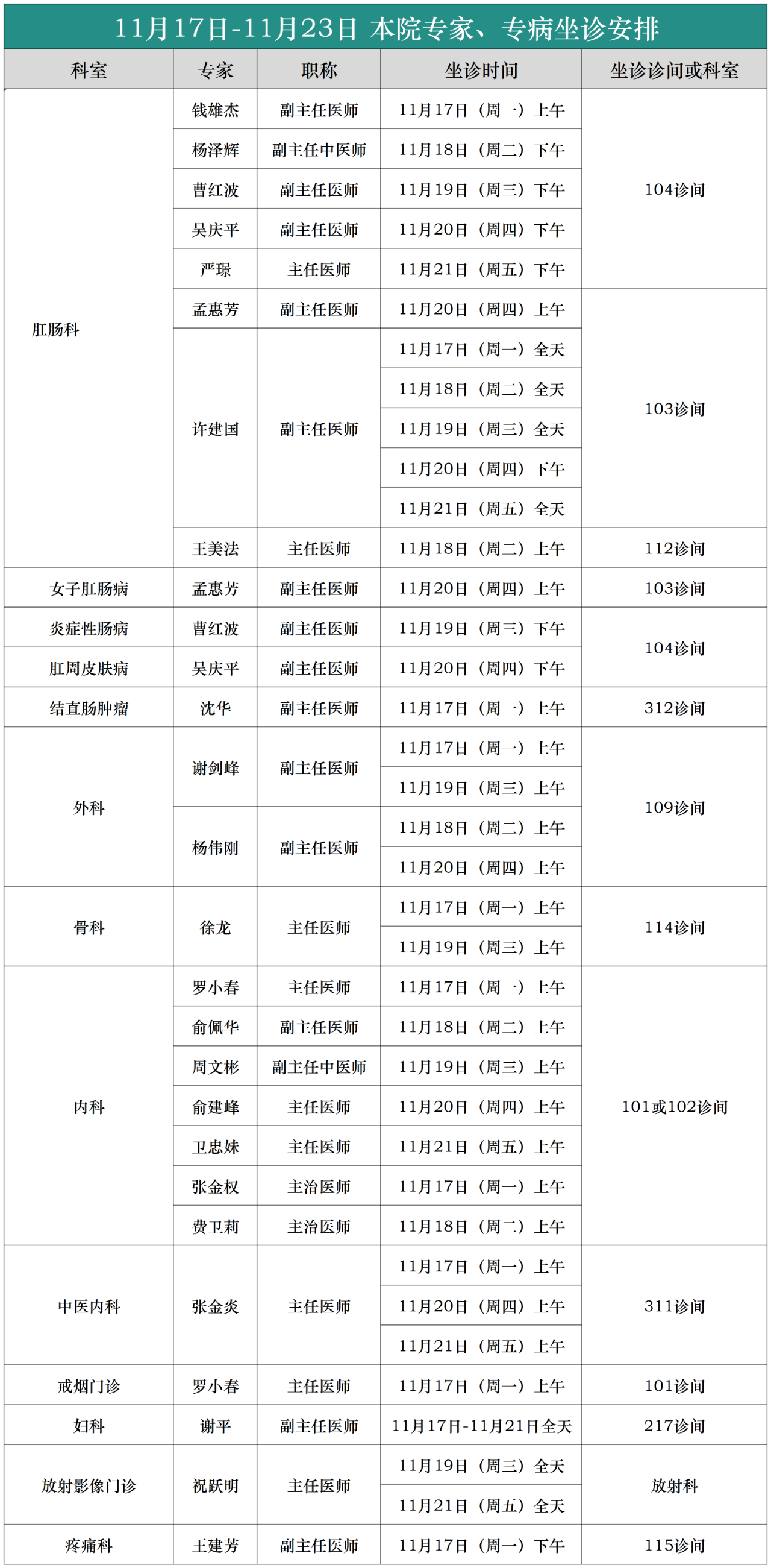 (11月17日-11月23日)本院专家、专病坐诊安排