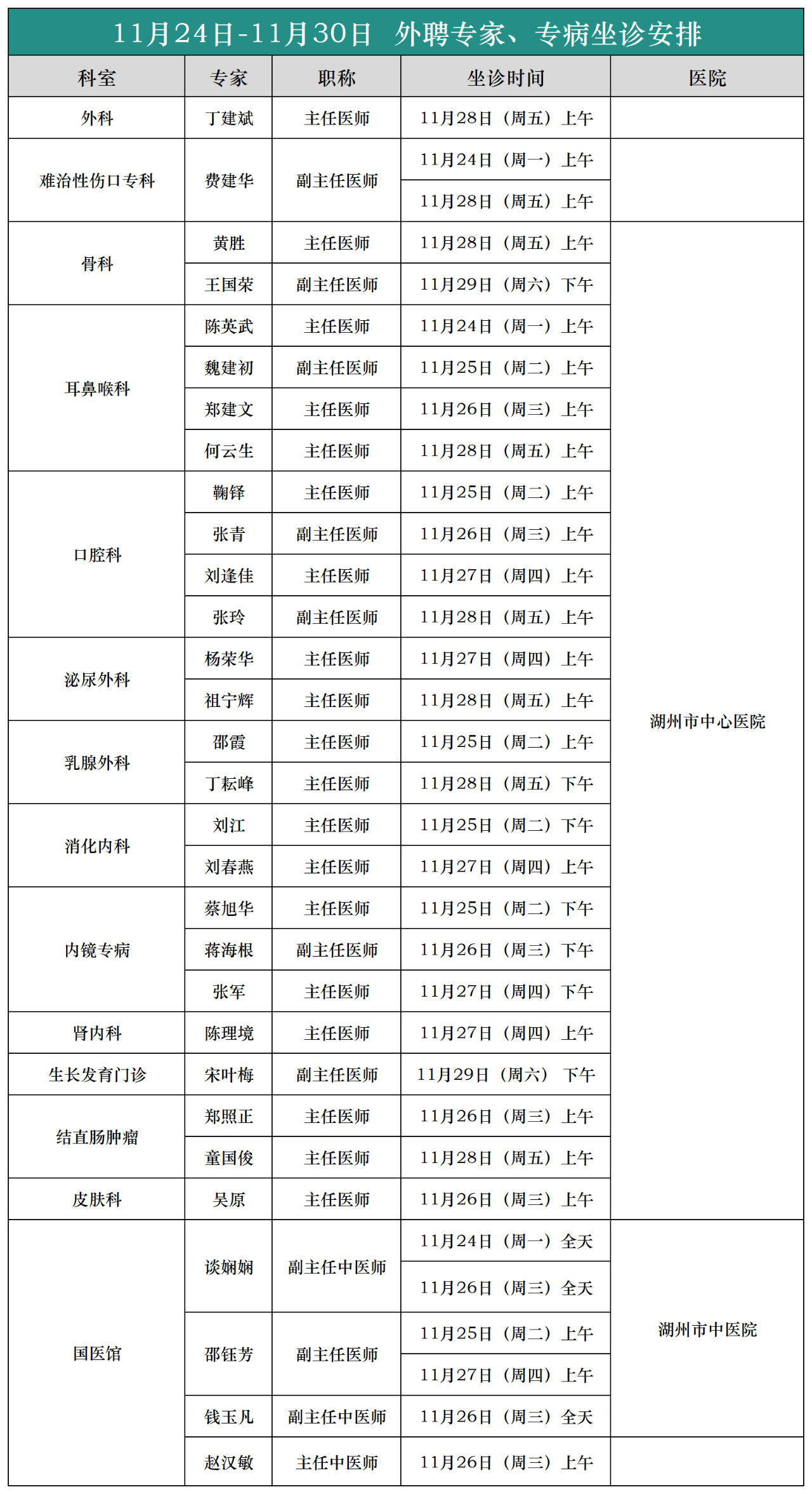 【专家|医讯】吴兴区中西医结合医院(11月24日--11月30日)专家、专病门诊安排