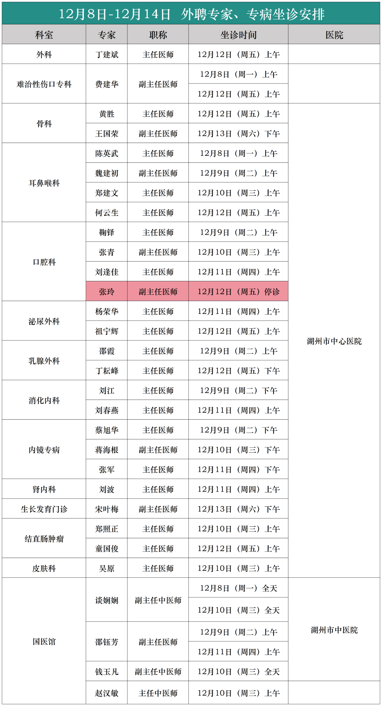 【专家|医讯】吴兴区中西医结合医院(12月8日--12月14日)专家、专病门诊安排