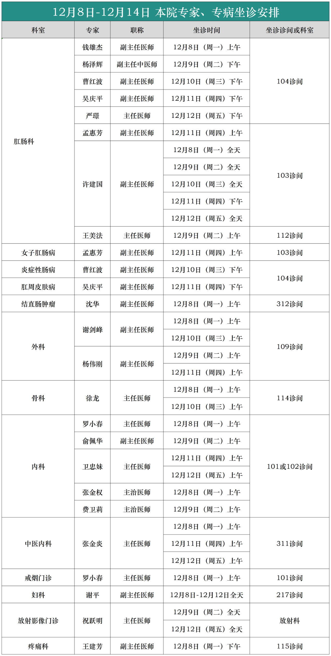 (12月8日-12月14日)外聘专家、专病坐诊安排