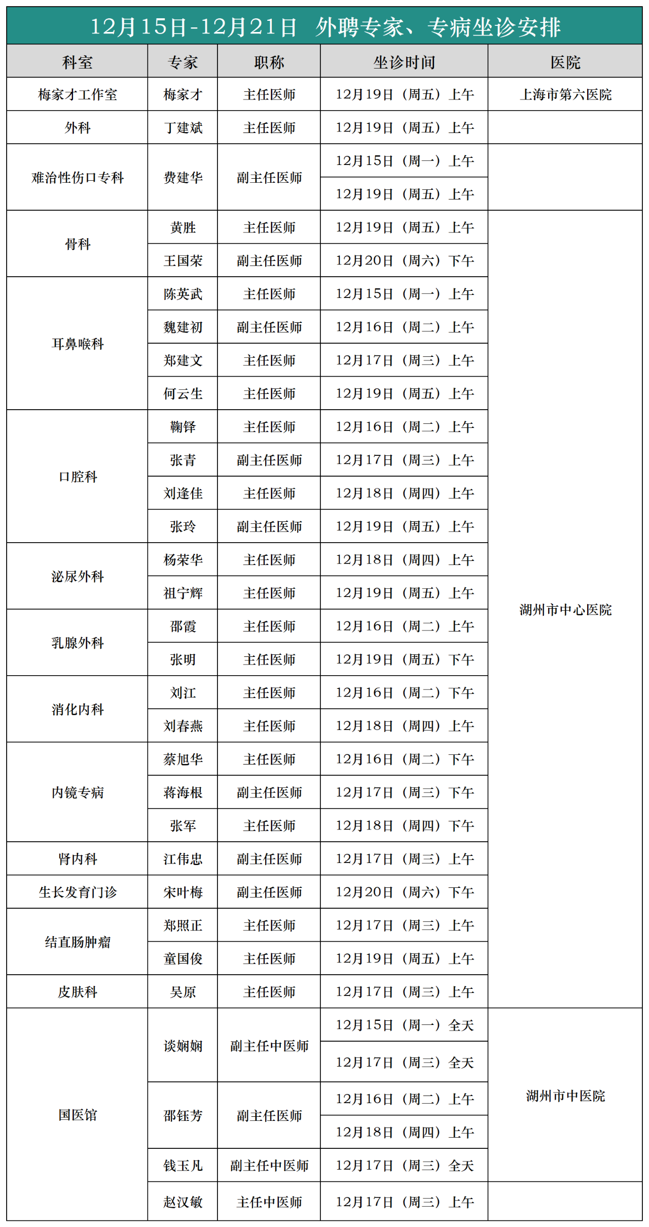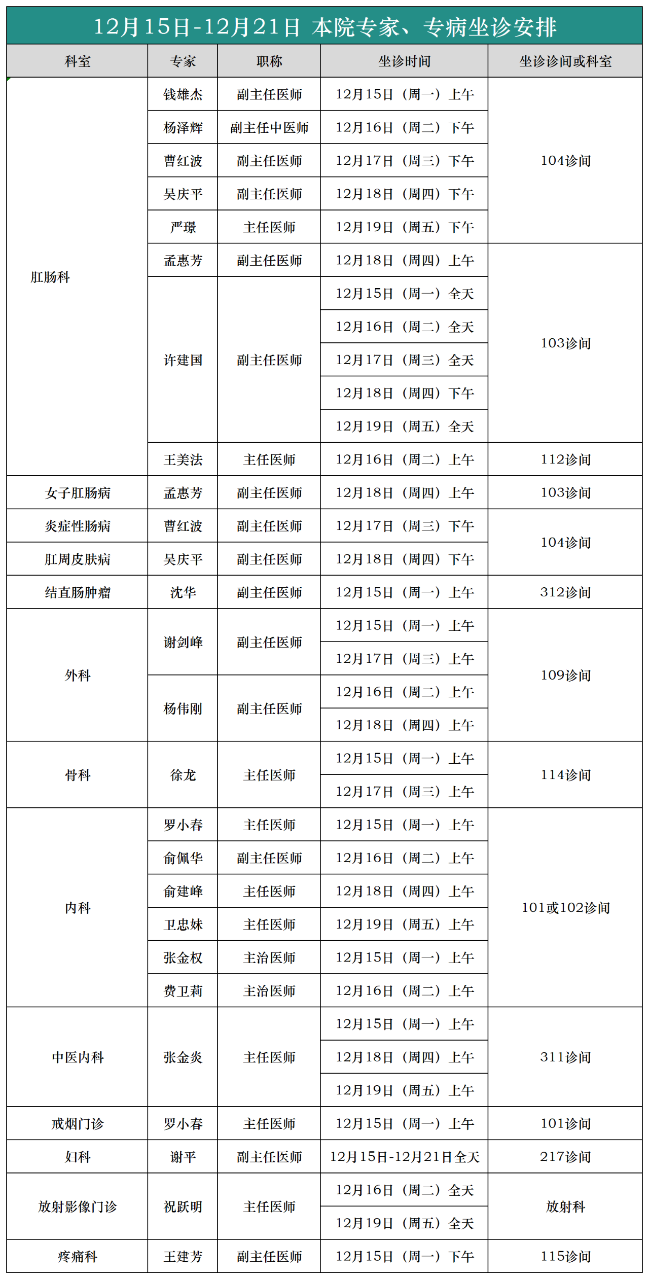 (12月15日-12月21日)外聘专家、专病坐诊安排