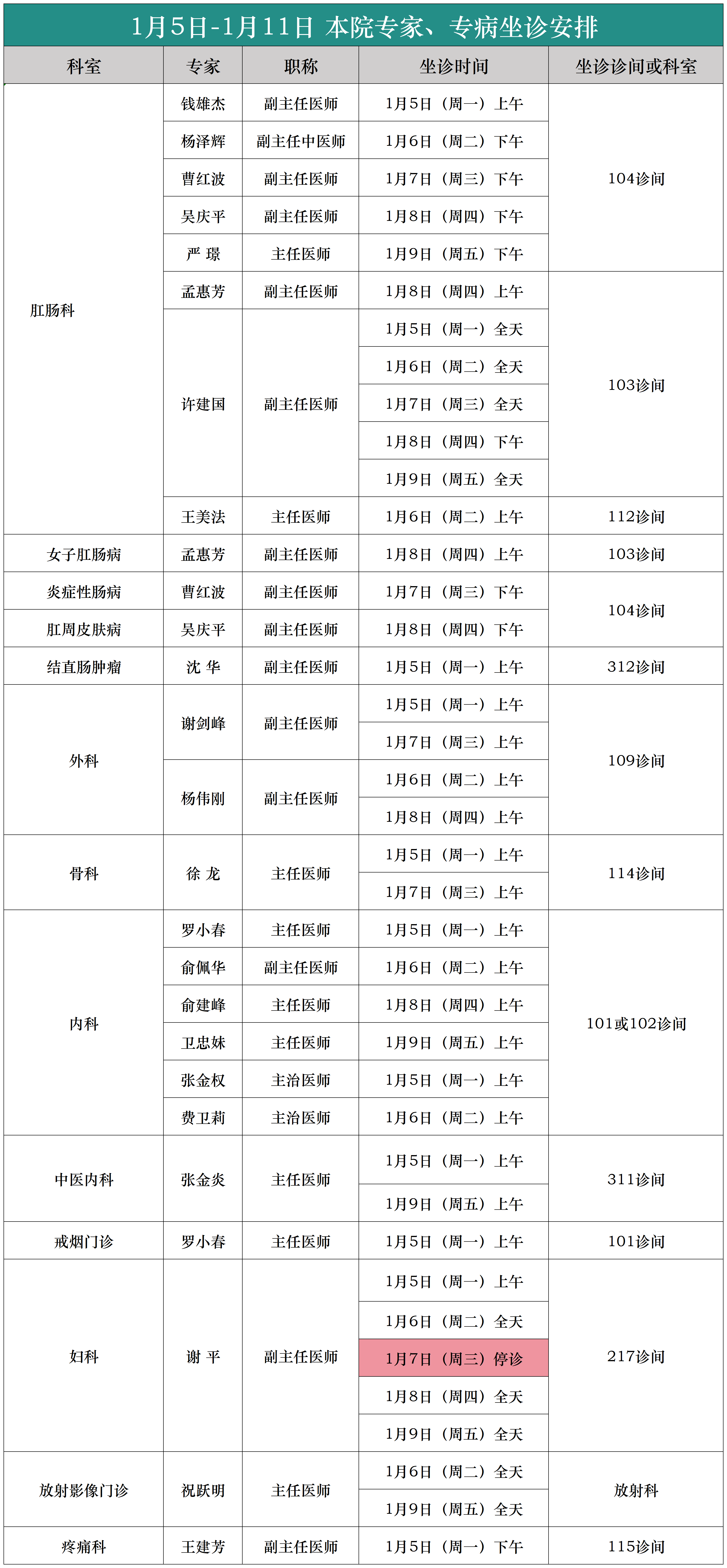 (1月5日-1月11日)外聘专家、专病坐诊安排