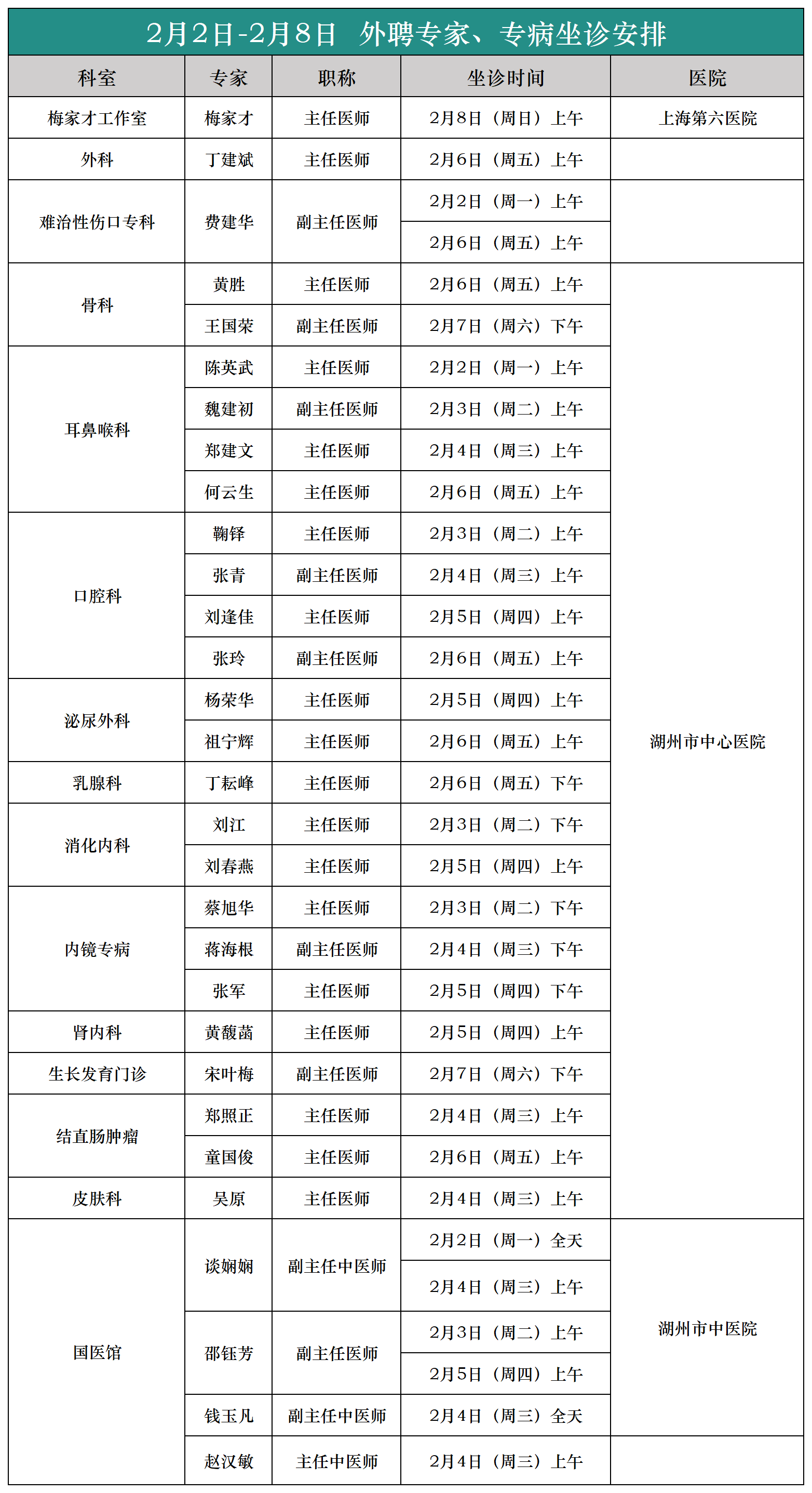 【专家|医讯】吴兴区中西医结合医院(2月2日--2月8日)专家、专病门诊安排