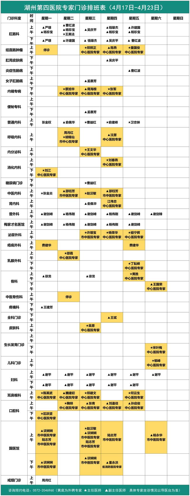 【四院|医讯】湖州第四医院 下周(4月17日--4月23日)专家门诊排班表
