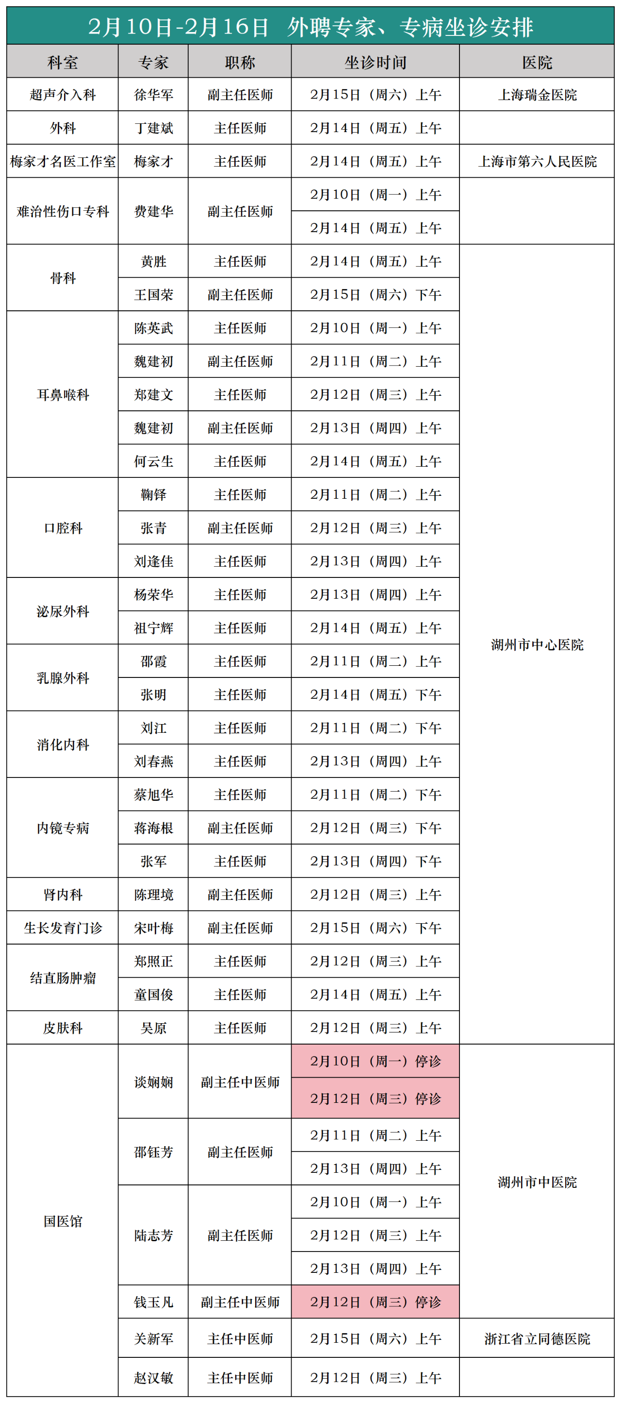 【专家|医讯】吴兴区中西医结合医院下周(2月10日--2月16日)专家、专病门诊安排
