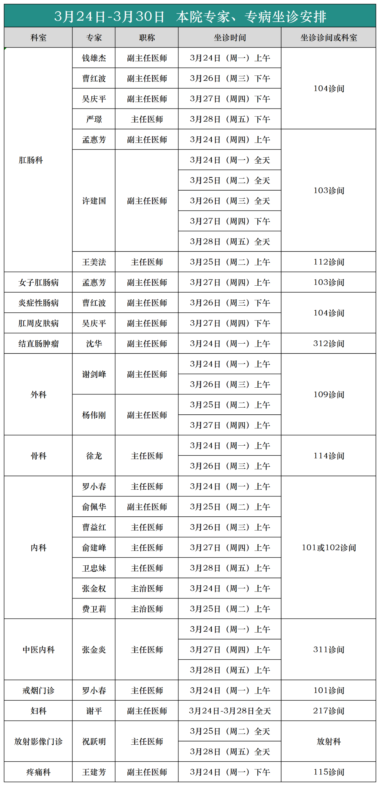 下周(3月24日-3月30日)外聘专家、专病坐诊安排
