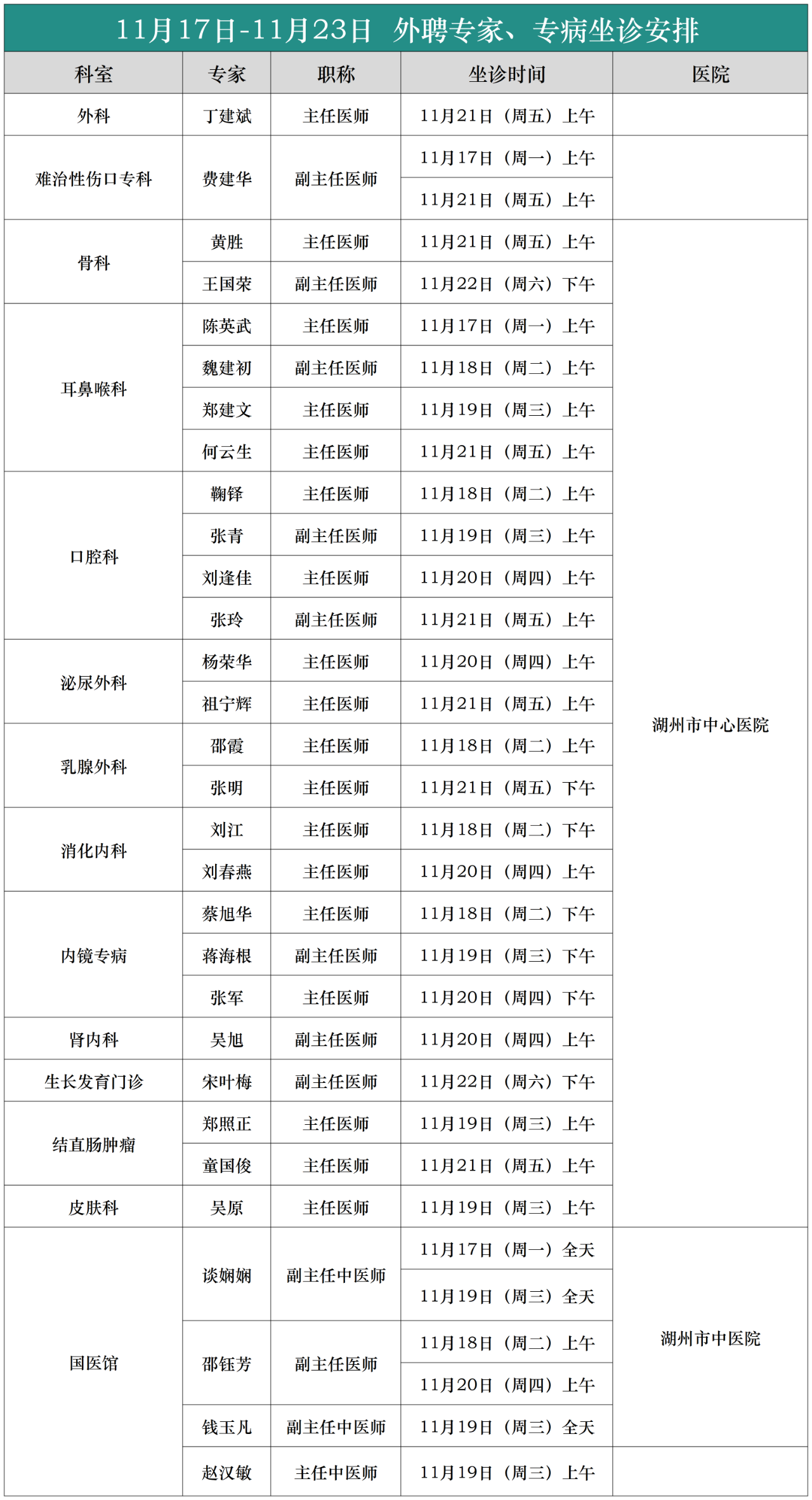 【专家|医讯】吴兴区中西医结合医院(11月17日--11月23日)专家、专病门诊安排