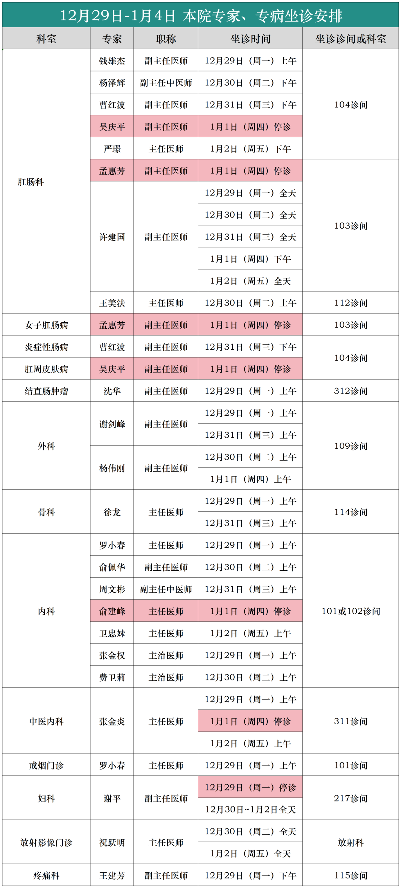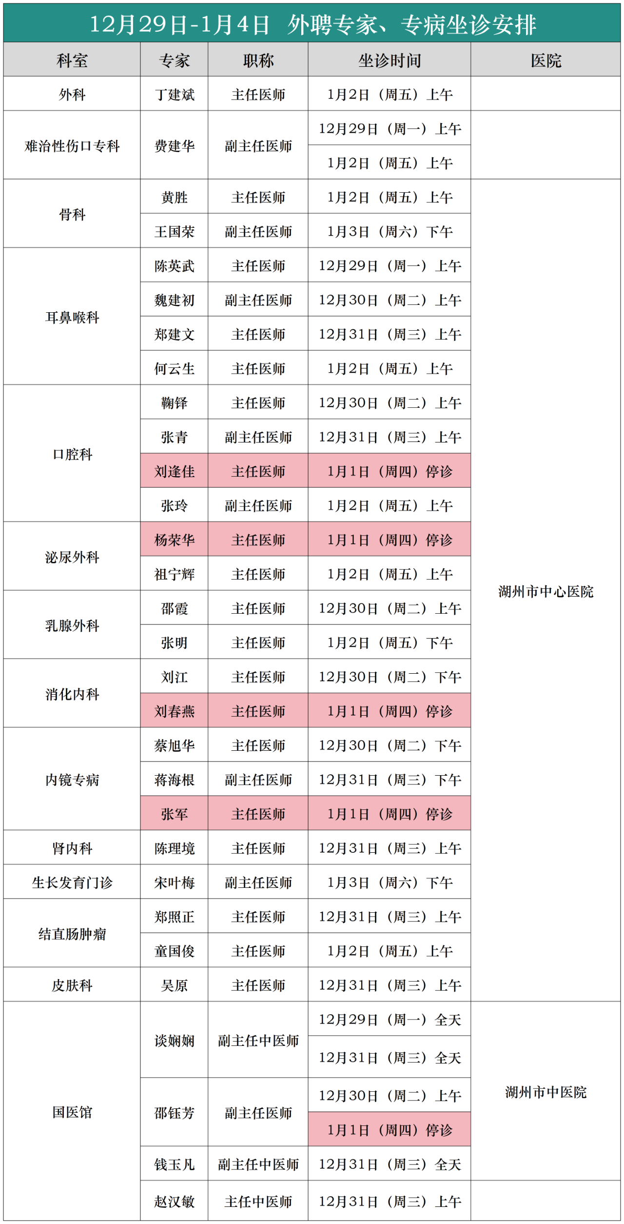 (12月29日-1月4日)外聘专家、专病坐诊安排