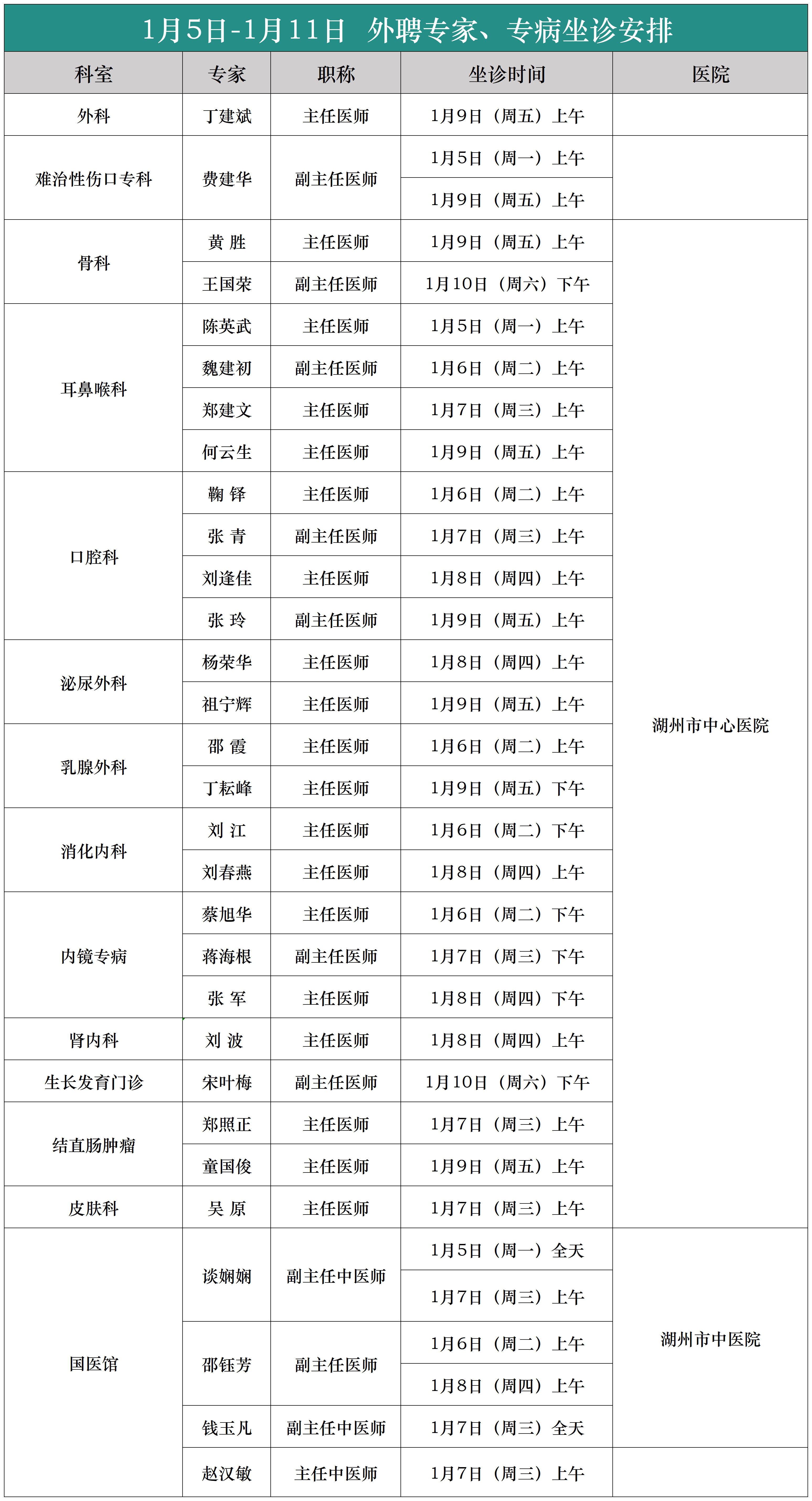 (1月5日-1月11日)外聘专家、专病坐诊安排